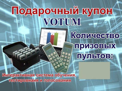 При покупке любого комплекта VOTUM, Вы получаете подарочный купон. Под защитным слоем Вы найдете число, которое означает количество выигрышных пультов. Этими пультами Вы можете либо дополнить свой следующий купленный комплект, либо собрав в сумме более 15 пультов, получить целый комплект при следующей Вашей покупке!