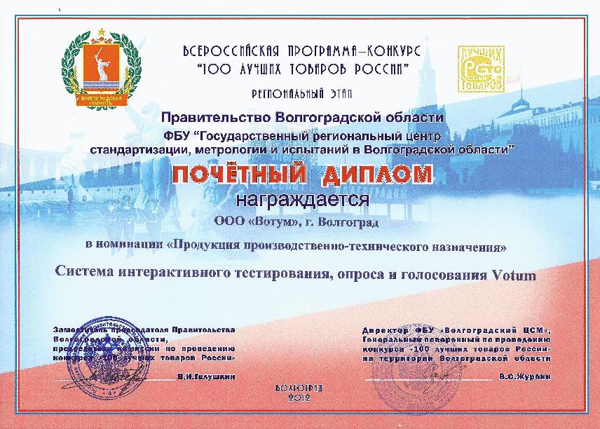33 наименования товаров, были признаны победителями регионального этапа конкурса и получили из рук Владимира Демидова - начальника областного управления предпринимательства - соответствующие дипломы. Компания ООО "Вотум" была награждена почетным дипломом в номинации "Продукция производственно-технического назначения"!