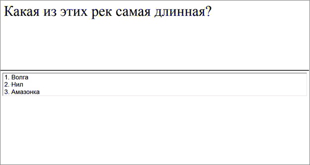 Вопрос на установление соответствия предполагает выбор номера подходящего варианта из всех предложенных. То есть, даны два столбика - для каждого варианта из первого столбика необходимо указать соответствующий вариант из второго. Вопрос с сопоставлением удобно применять в случаях, когда требуется упорядочить элементы или сгруппировать какие либо элементы по определенным признакам.