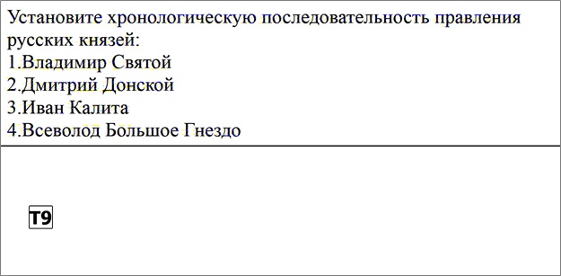 Например, для приведенного выше вопроса правильный последовательность: Владимир Святой, Всеволод Большое Гнездо, Иван Калита, Дмитрий Донской, то есть варианты 1, 4, 3, 2. Значит нужно последовательно нажать: 1, 4, 3, 2, send.