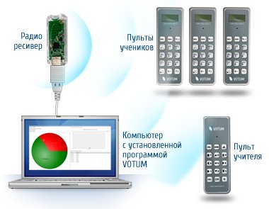 Ученикам раздаются беспроводные пульты. С их помощью они отвечают на вопросы, выбирая правильный ответ из нескольких вариантов или набирая ответ на пульте. Так же они могут дать знать учителю, что у них появились вопросы. Сигналы с пультов поступают в компьютер посредством радио-ресивера, обрабатываются программой, и VOTUM мгновенно выдает результаты.